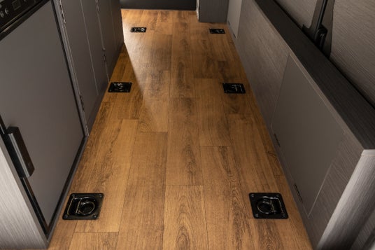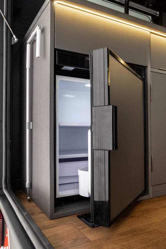 “くつろぎ”と“機能性”を両立した室内空間 車内に入ると、まず目に入るのは木目調キャビネットとブラックアクセントで統一された落ち着きあるインテリア。