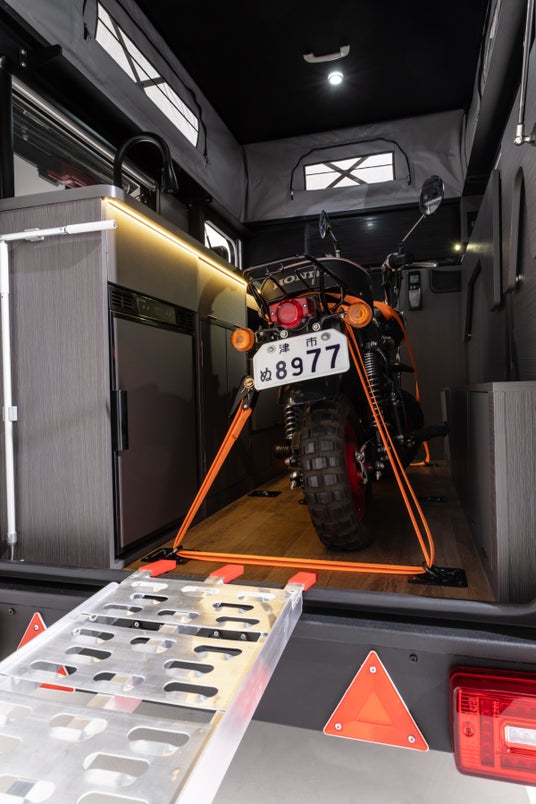 リアエントランスからスロープを伸ばせば、モンキーなどの小型バイクをそのまま積載可能。キャンプ地でのちょっとした移動や、旅先での探索をもっと自由に、もっと楽しくしてくれます。