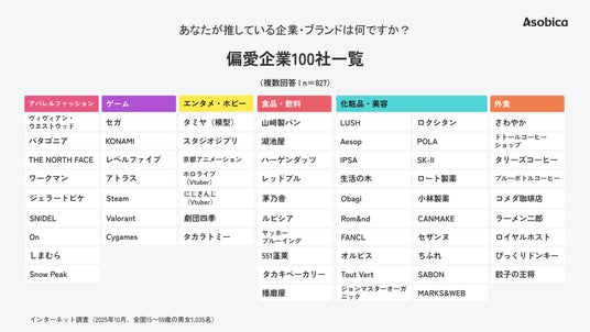 顧客のホンネデータを収集/分析するプラットフォーム「coorum(コーラム)」を運営する株式会社Asobica(本社:東京都品川区、代表取締役社長 兼 CEO:今田孝哉)は、2025年11月に1,030名の消費者を対象に行った物価高騰下における「企業やブランドに対する『推し消費 ※1』」調査で判明した「推し企業ランキング」において、投票数が1-2票と少ないものの、「その1人にとっては代え難い存在」である企業群を「消費者が選んだ“偏愛企業”100社」として選出いたしました。