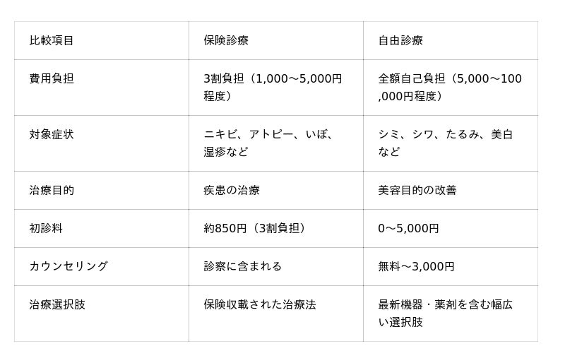 自由診療とは、健康保険が適用されない診療のことである。シミ取りレーザー、ボトックス注射、ヒアルロン酸注入など、病気の治療ではなく美容目的の施術が該当し、費用は全額自己負担となる。