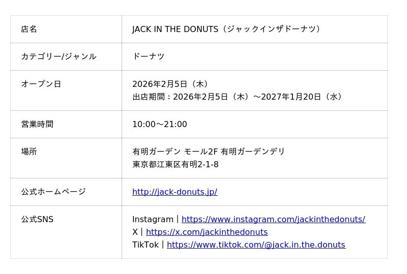 住友不動産商業マネジメント株式会社(本社:東京都新宿区、代表取締役社長:山本 直人)が運営する商業施設「住友不動産 ショッピングシティ 有明ガーデン」(所在地:東京都江東区)に、2026年2月5日(木)、ドーナツ専門店「JACK IN THE DONUTS(ジャック イン ザ ドーナツ)」がオープンいたします。本店舗は、東京湾岸エリア初出店となります。