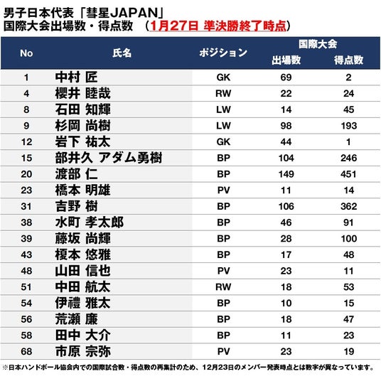 公益財団法人日本ハンドボール協会は、現在クウェートで開催されている第22回男子ハンドボールアジア選手権の準決勝・バーレーン戦(現地時間1月27日)において、男子日本代表「彗星JAPAN」の藤坂尚輝選手が、日本代表国際試合通算100得点を達成しましたことをお知らせいたします。