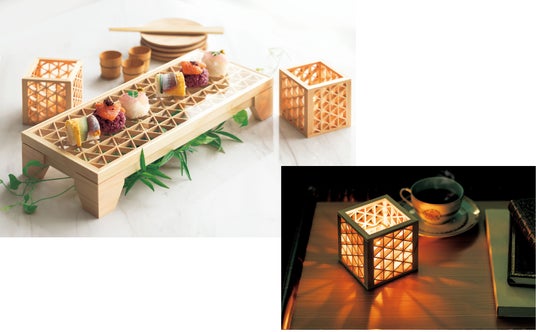 「組手障子」は装飾性に富み柔らかな光を通す美しい間仕切りとして、鎌倉時代から日本の住空間に欠かすことのできない役割を担ってきました。その工程は凹型の木片を釘を使わずに組み上げる緻密な手作業で、0.1ミリの誤差も許されません。香川県では後世に残すべく、平成元年に伝統的工芸品に指定。この美の技法を暮らしに生かすべく「トレイ」と「キャンドルカバー」へリデザイン。建具の現代風アレンジで定評のある伝統工芸士の森本 隆さんの製作。