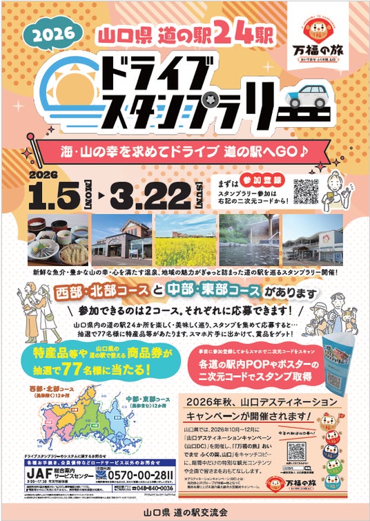 JAF(一般社団法人 日本自動車連盟)山口支部(支部長 大原敏之)は、1月5日(月)から開催されている「2026 山口県 道の駅24駅ドライブスタンプラリー」(主催:山口県 道の駅交流会)の実施に協力しています。