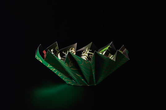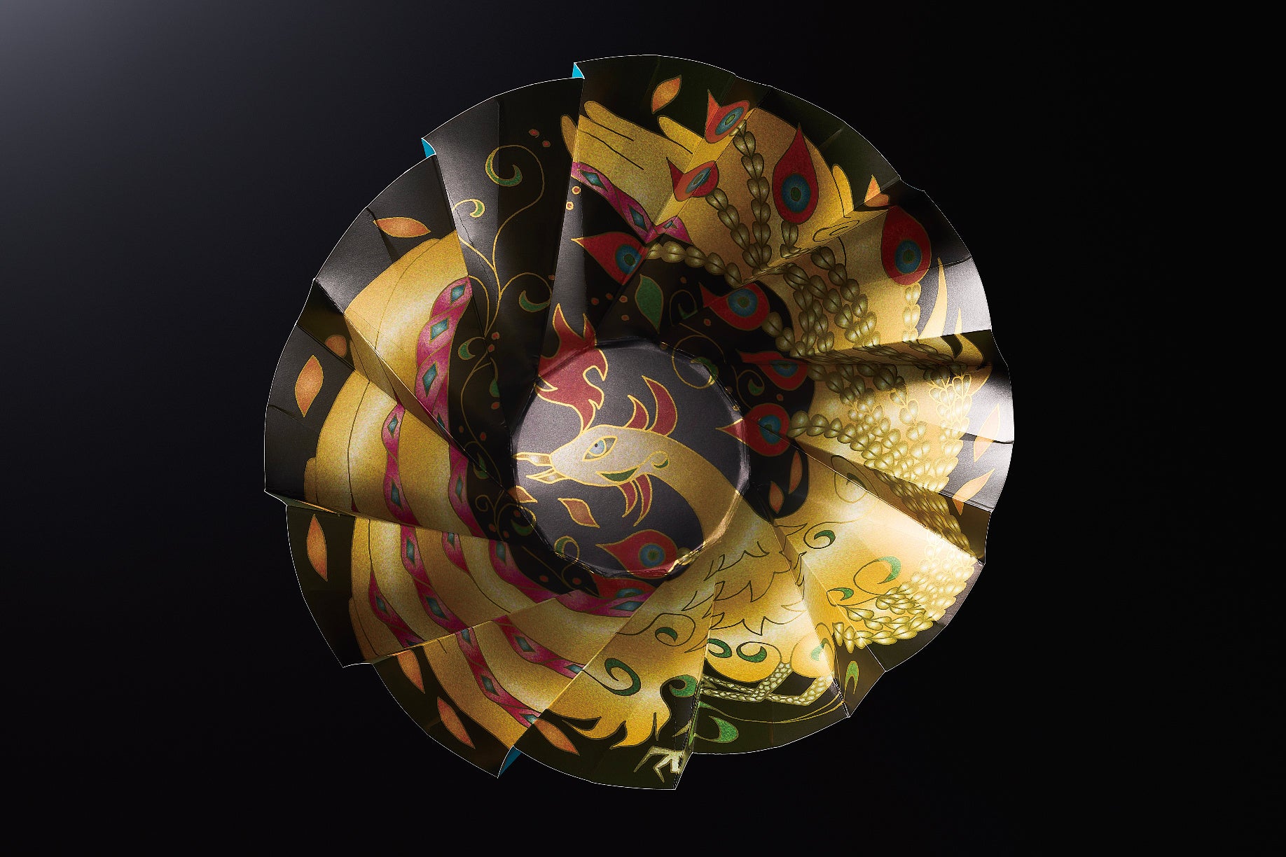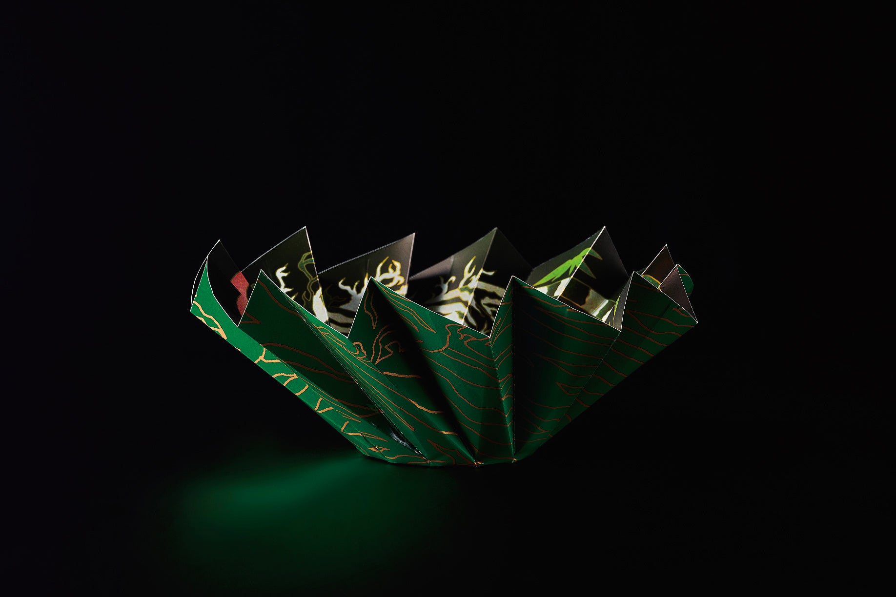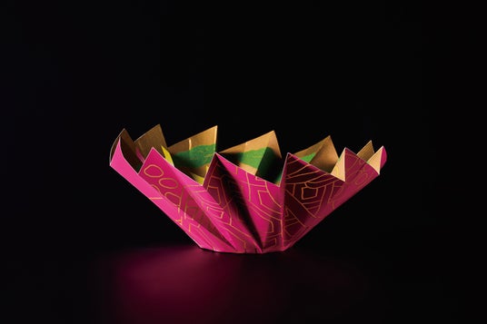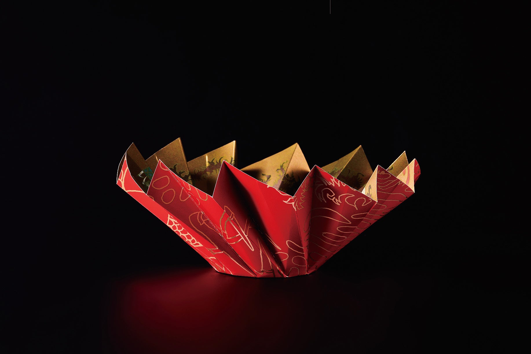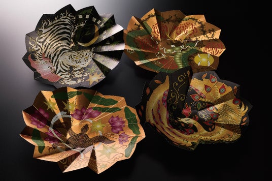 日本の文化おりがみの発想をもとに、円形の紙をジャバラに折って作った容器。