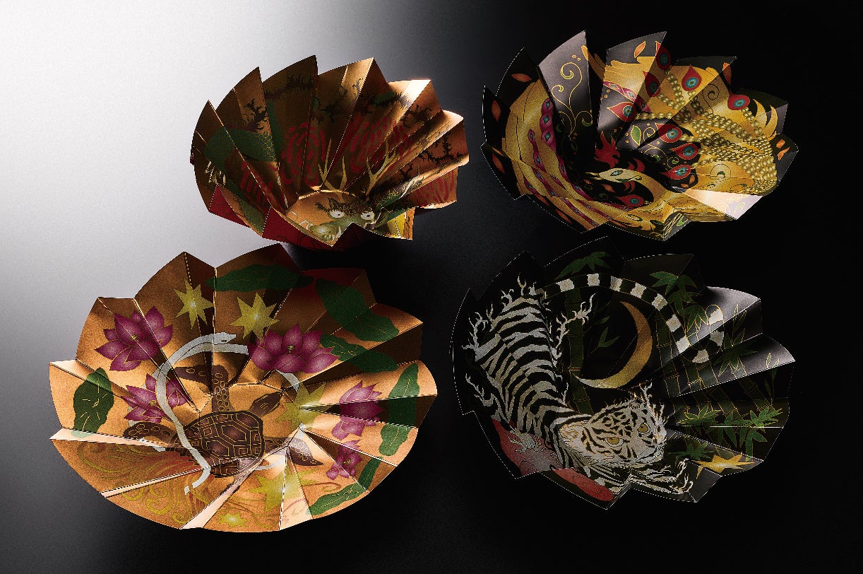 絵柄は、古代中国で生まれ日本の古墳や建築設計にも大きな影響を与えた四神をモチーフに、龍・虎・亀・鳥の4種をセット。