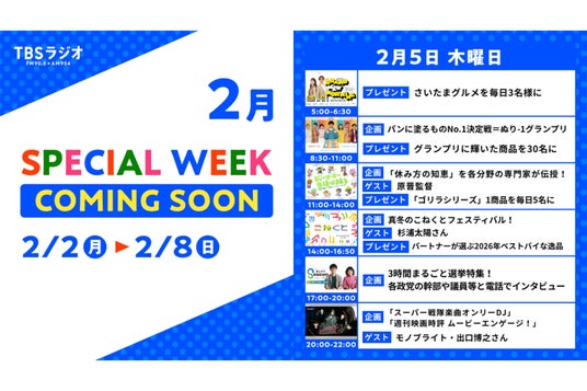 TBSラジオは2月2日(月)~2月8日(日)にかけて、各番組で特別企画をお届けするスペシャルウィークを開催します。ぜひリアルタイムでお楽しみください!