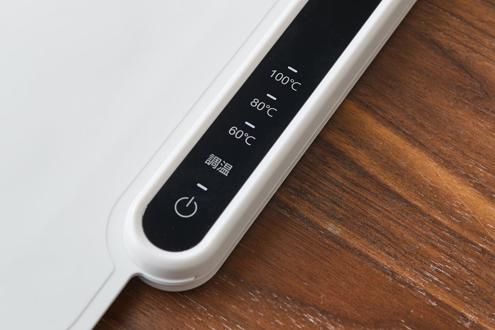 本製品は、60/80/100℃の3段階温度調節と、電源・温度調節に絞ったタッチパネル式のシンプル操作を採用。鍋や大皿料理、朝食、ティータイムなどの食卓シーンはもちろん、冷凍食品の解凍や生地の発酵(60℃)にも活躍します。さらに、ウォーマー部分は柔らかなシリコン製で、使わない時は巻いてコンパクトに収納でき、お手入れもしやすい仕様です。