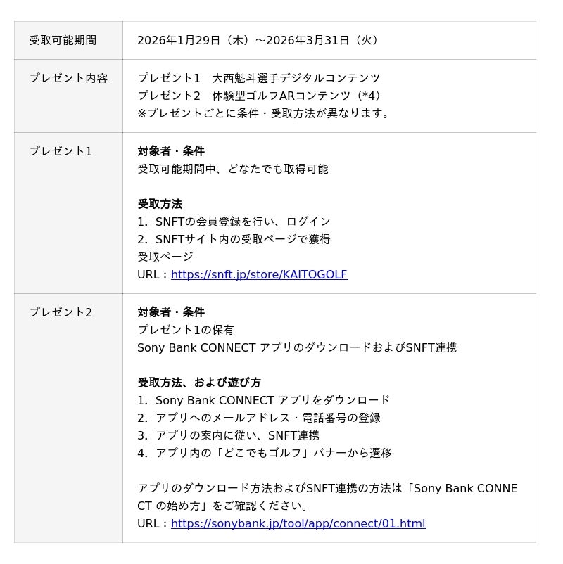 ソニー銀行が応援する世界で活躍中の大西魁斗選手のデジタルコンテンツ(NFT)(*1)をプレゼントします。また、同デジタルコンテンツを保有し、Sony Bank CONNECT のダウンロードおよびSNFT(*2)連携などの所定の条件を満たしたかたが遊べる、体験型ゴルフARコンテンツ「どこでもゴルフ」を合わせて提供します。