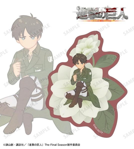エレン、ミカサ、アルミン、ジャン、ヒストリア、エルヴィン、ハンジ、リヴァイのイラストをボタニカルデザインに落とし込んで繊細なタッチで新たに描き起こし、ゆらゆら動くアクリルスタンドに仕上げました。