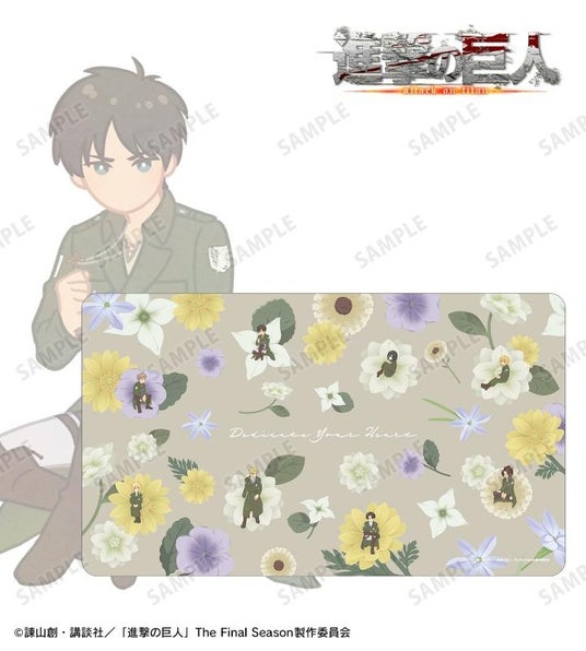 エレン、ミカサ、アルミン、ジャン、ヒストリア、エルヴィン、ハンジ、リヴァイのイラストをボタニカルデザインに落とし込んで繊細なタッチで新たに描き起こし、マルチデスクマットに仕上げました。
