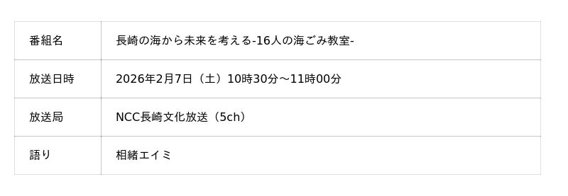 一般社団法人NEXTながさきごみゼロプロジェクトは、地元の小学生が授業を通じて、海洋ごみ問題と向き合う様子を取材したドキュメント番組「長崎の海から未来を考える-16人の海ごみ教室-」を制作しました。2026年2月7日(土)10時30分から、長崎文化放送(NCC)で放送されます。