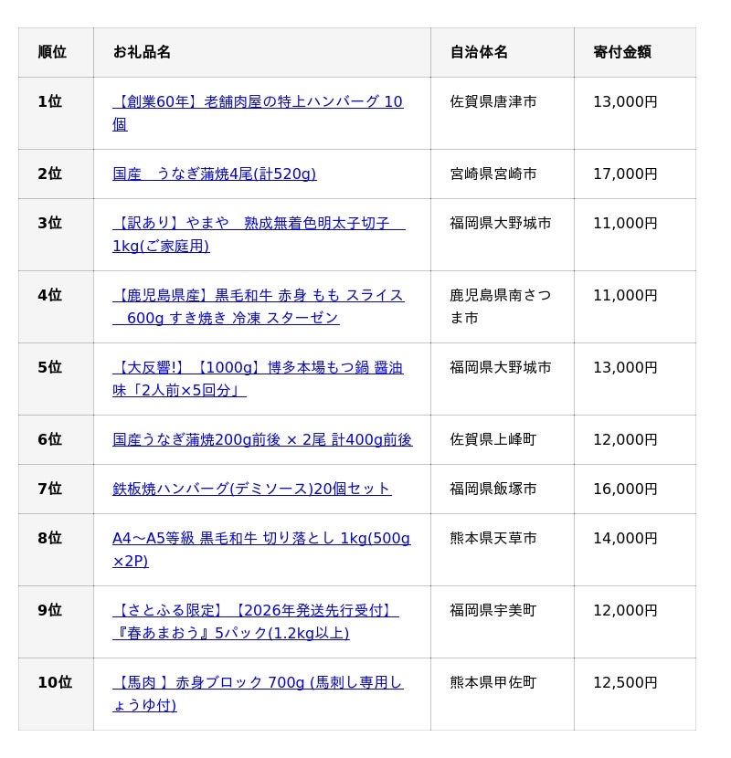 ふるさと納税ポータルサイト「さとふる」を運営する株式会社さとふる(本社:東京都中央区、代表取締役社長 兼 CEO:藤井 宏明)は、「さとふる」における<九州・沖縄版>2025年人気お礼品ランキング(確定)(※1)を発表します。