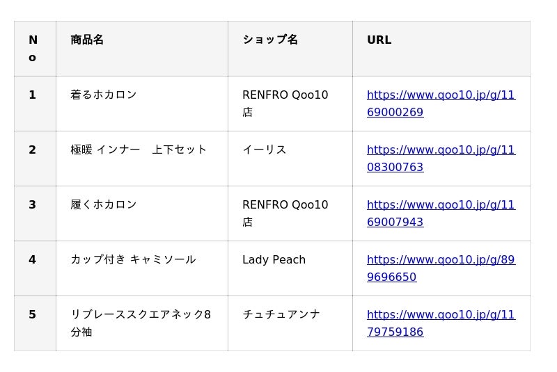 Qoo10(https://www.qoo10.jp/)サイト上、「インナー」カテゴリーの各販売個数に基づいたランキングです。