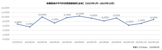 パーソルキャリア株式会社が運営する転職サービス「doda(デューダ)」(編集長:桜井 貴史)は、dodaエージェントサービスを利用して2025年12月に転職決定した個人の、転職前後の平均年収変動額と年収変動割合を発表いたします。