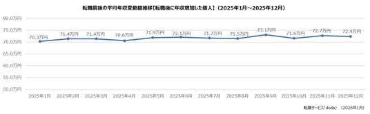 転職後に「年収増加」した個人の年収は、平均で72.4万円(前月差:-0.3万円)増加しました。