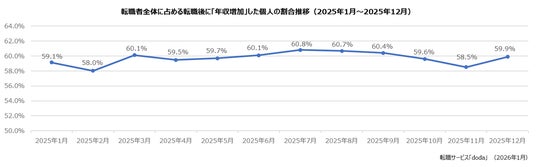 転職後に「年収増加」した個人の割合は、59.9%(前月差:+1.4ポイント)でした。