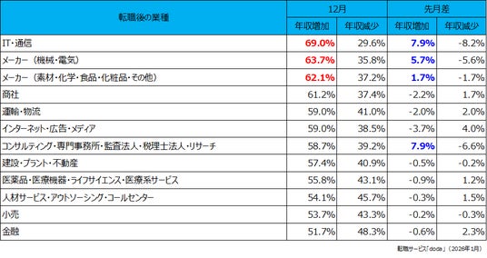 転職後に年収増加した個人が多かった業種は、「IT・通信」(69.0%)、次いで「メーカー(機械・電気)」(63.7%)、そして「メーカー(素材・化学・食品・化粧品・その他)」(62.1%)が続きました。