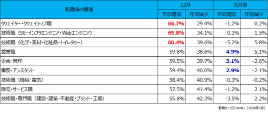 転職後に年収増加した個人が多かった職種は、「クリエイター・クリエイティブ職」(66.7%)、次いで「技術職(SE・インフラエンジニア・Webエンジニア)」(65.8%)、そして「技術職(化学・素材・化粧品・トイレタリー)」(60.4%)が続きました。