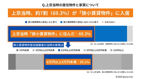 また、都内を中心に家賃上昇が続く中、居住面積が比較的コンパクトな「狭小賃貸物件(一般的に15平方メートル 未満(9畳未満)の広さ)」に関する調査を実施。上京当時に住んでいた物件について尋ねたところ、全体の約7割(69.3%)が「狭小賃貸物件に該当する住居に住んでいた」と回答しました。さらに、該当する回答者151名を対象に当時の家賃を聞いたところ、「6万円以上8万円未満(39.1%)」が最も多い結果となりました。