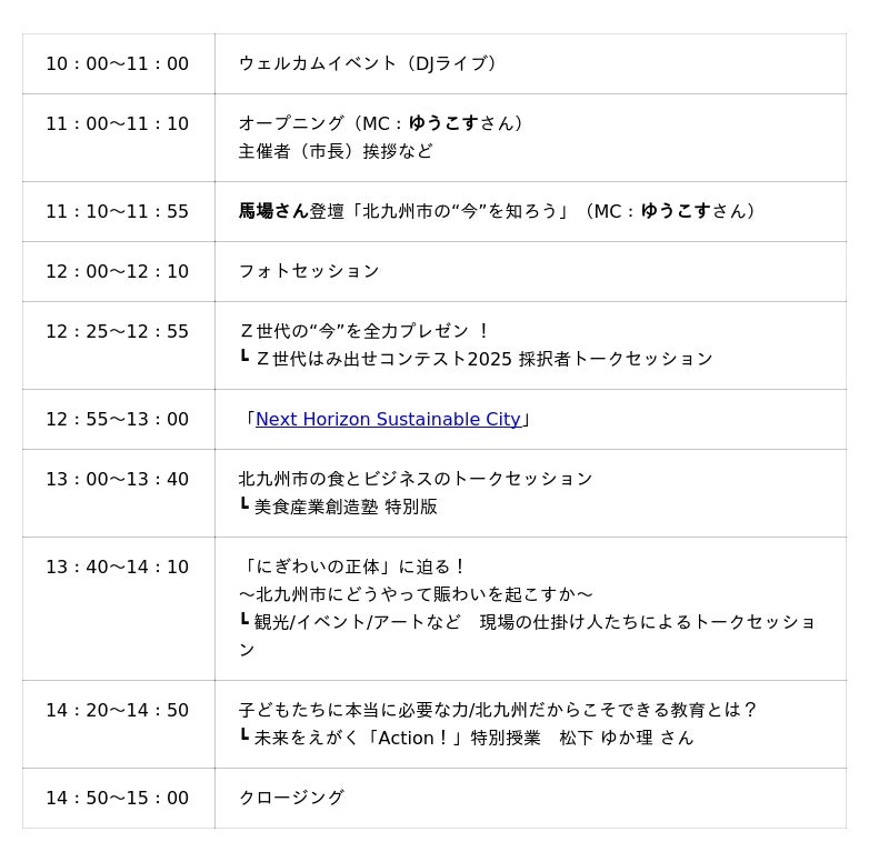 Action!Fesでは、インフルエンサーで実業家の ゆうこす さんをMCに迎え、馬場さんのこれまでの取り組みについて北九州市の武内市長と下川クリエイティブディレクターがお話を伺うほか、八木田 一世さん(SEE℃代表・北九州市立大学大学院特任教授)、松下ゆか理さん(SPOT TEACHER・共育パレット株式会社代表取締役)などが登壇するトークセッション、ステージイベントが行われます。