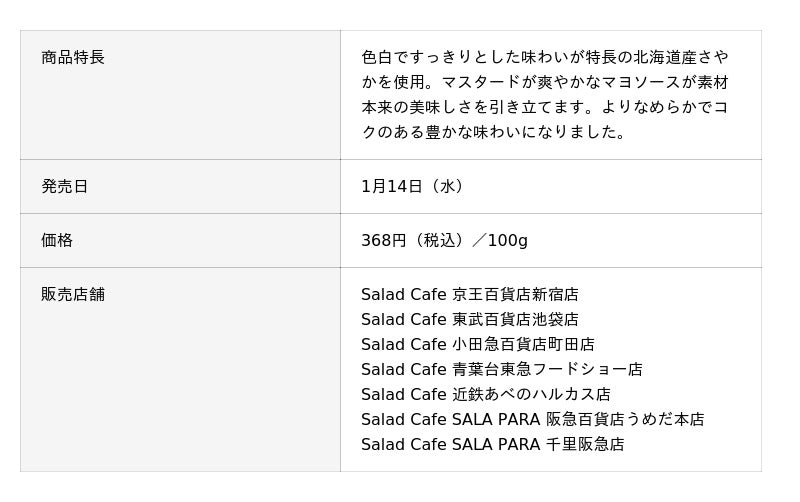 サラダカフェ株式会社は、ポテトサラダの商品ラインナップを拡充し、新商品1品とリニューアル商品3品の計4商品を、関西・関東で展開するサラダショップにて1月中旬より発売しましたのでお知らせします。