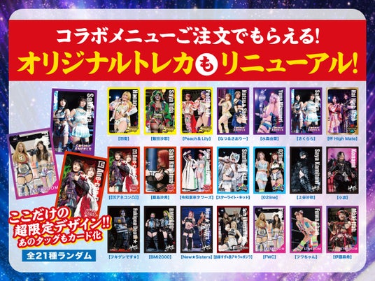2月1日(日)より、店内装飾やフォトスポットなどをリニューアルし、新たな「スターダム」の世界観で、コラボメニューなどが楽しめる仕様といたします。また、コラボメニューご注文の方にはスターダム店限定オリジナルトレーディングカード(全21種ランダム)をプレゼントします。こちらのトレーディングカードのラインナップも2月1日(日)より順次刷新いたします。