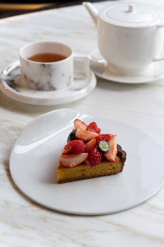カカオ含有量72%のオーガニックチョコレートが、タルトに詰められたレモンのコンフィ、ヘーゼルナッツのプラリネと、美しいハーモニーを奏でます。