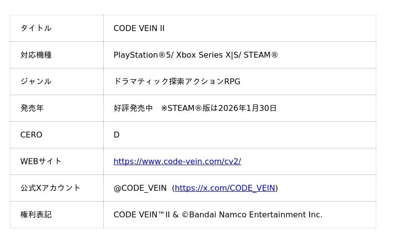 ドラマティック探索アクションRPG『CODE VEIN II』を本日1月29日(STEAM(R)版のみ1月30日)に