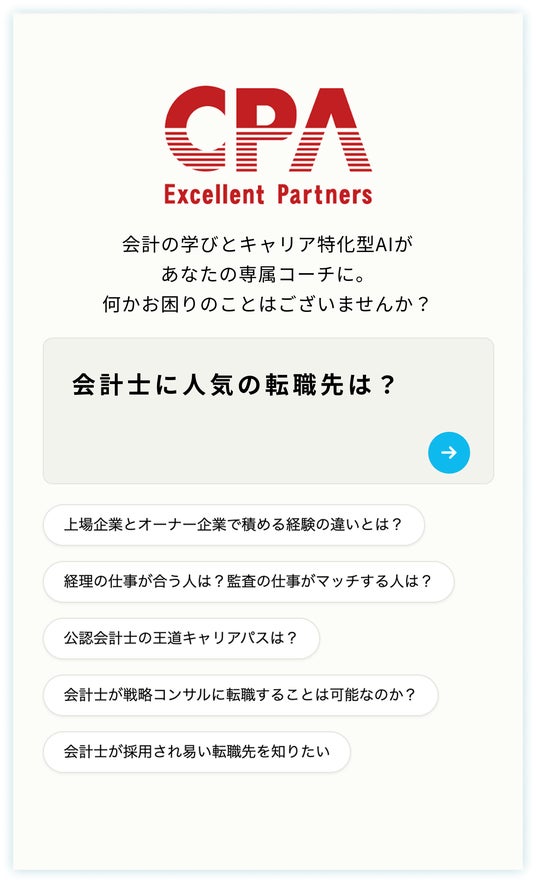 CPAエクセレントパートナーズ株式会社(本社:東京都新宿区、代表取締役:国見健介)は、同社グループが運営する会計ファイナンス人材特化型の転職エージェント「CPASSキャリア」および簿記や会計ファイナンスを完全無料で学べるeラーニング「CPAラーニング」において、会計ファイナンス人材の専属キャリアパートナー「キャリアAI」をリリースします。