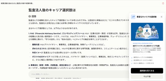 本サービスは、CPAエクセレントパートナーズのトップキャリアアドバイザーの知見を搭載した「対話型AI」です。求職者との質疑応答を通じて潜在的な意向を掘り起こし、本人も気づいていない視点の提示や自己成長を促す助言を行います。 最大の特徴は、単なる求人マッチングを目的としていない点です。求職者のキャリアパスを最優先に考え、時には無料のeラーニングサービスによるスキルアップを提案するなど、視野を広げるための多角的な選択肢を提示します。