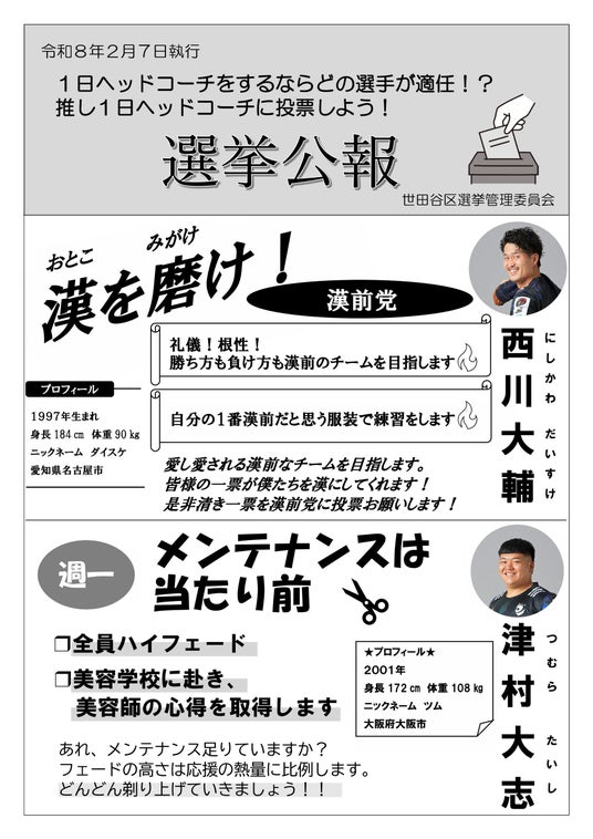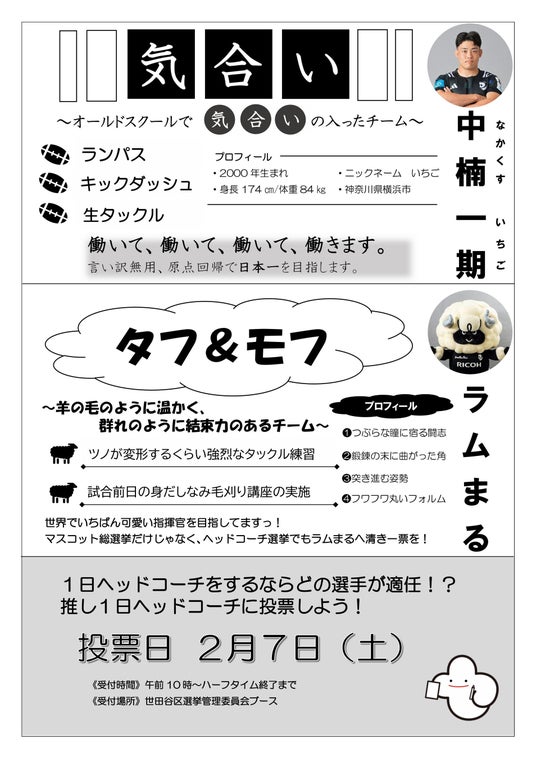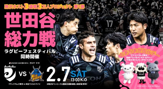 2026年2月7日(日) に開催される NTTジャパンラグビー リーグワン2025-26 第7節 ブラックラムズ東京対埼玉パナソニックワイルドナイツ戦にて、世田谷区選挙管理委員会と連携し、ブラックラムズ東京選手を候補者に見立てた模擬選挙『トライ!投票体験コーナー』を実施します。