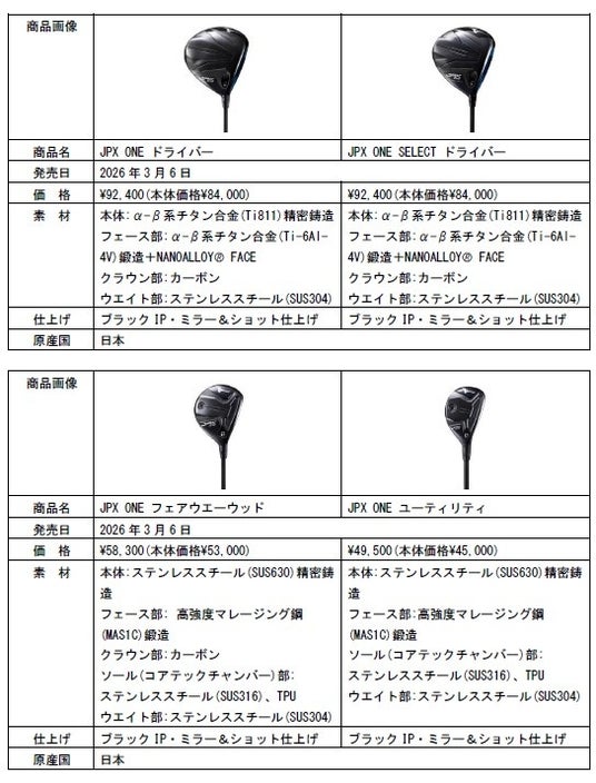 今回発売する「JPX ONE」シリーズは、『NANOALLOY(R)フェース』の高初速性能をベースに、高い慣性モーメントと広い高反発エリアによる“やさしさ”を追求した「JPX ONE」と、体積はそのままでヘッドサイズが小さく見えるような設計により“操作性”を両立した「JPX ONE SELECT」の2機種のドライバーをラインナップします。また、「ST-MAX 230」の後継モデルとして、高初速性能と“やさしさ”を追求したフェアウエーウッド、ユーティリティもラインナップします。