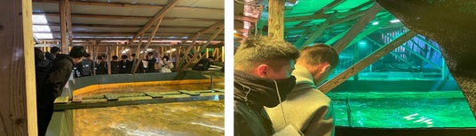 今回は、(有)山尾水産のかけ流し式の陸上養殖を見学させていただきました。養殖場にある大きな水槽を目の前にした生徒たちからは「おぉー」という歓声があがりました。緑色のLEDを照らした水槽の中では活発に泳ぎ回るヒラメも見受けられ、生徒たちは真剣なまなざしでヒラメの生態を観察していました。また、ヒラメのエサやりを体験した生徒からは「エサに群がるかと思ったが、養殖ヒラメは落ち着きがあった」など、実際に観察したからこそ得られるリアルな感想が聞かれました。底生魚であるヒラメ本来の性質を保ちつつ、緑色LED光照射によって成長が促されるという、生命科学と化学が融合した技術を学ぶことができました。