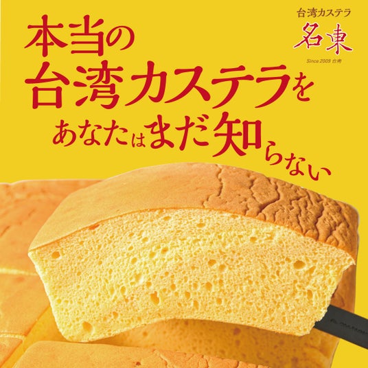 ■「名東」について「名東」は2009年に台湾南部の台南で創業した台湾カステラ専門店です。口に含むと「シュワッ」と泡のように消えていく、他では味わえないその美味しさで、瞬く間に行列のできる人気店となりました。