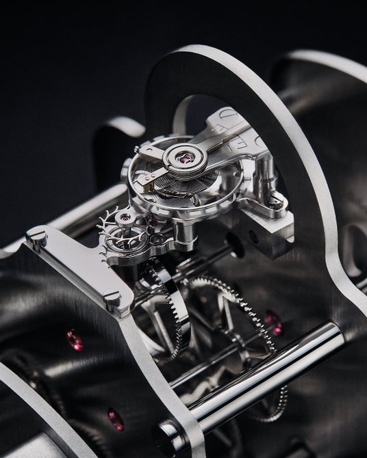 ルイ・ヴィトンのサヴォアフェールが織り成すこのシンフォニーは、ムーブメントを車両の中心に配置することで詩的な魅力を強めています。自動車とウォッチメイキングの世界の類い稀な出逢いの中で、従来はドライバー専用であった車両のキャビンに、ムーブメントのバランスホイールを収納。力強さと精度が調和した錬金術によって、このタイムピースに命を吹き込む、躍動的な機械の心臓部となっています。