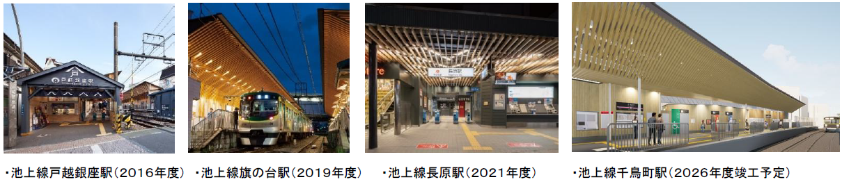 当社はこれまで、池上線の4駅で「木になるリニューアル」を実施してきました。戸越銀座駅・旗の台駅・長原駅においては、東京都多摩地区で生産される「多摩産材」の活用による“地産地消”に取り組んできました。また、2026年秋頃竣工予定の千鳥町駅においては、秋田県産の「あきた材」を取り入れることによる“地産都消”に取り組んでいます。