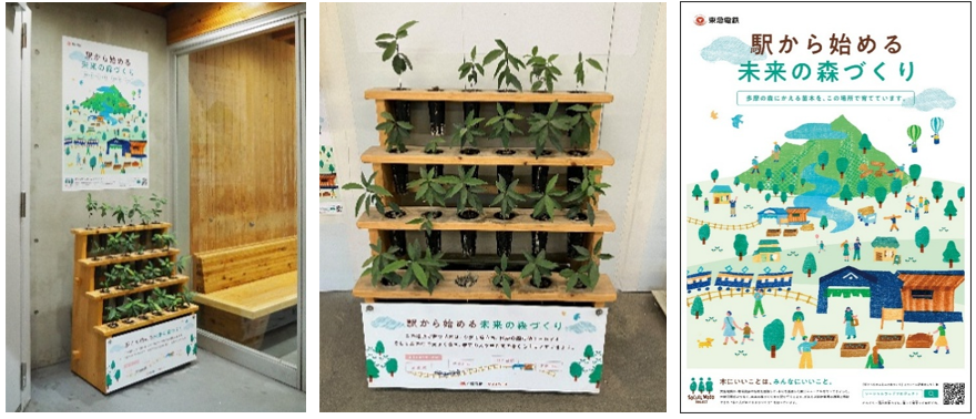 <駅で育てている苗木(左:旗の台駅、右:千鳥町駅)> <駅に設置しているポスター>