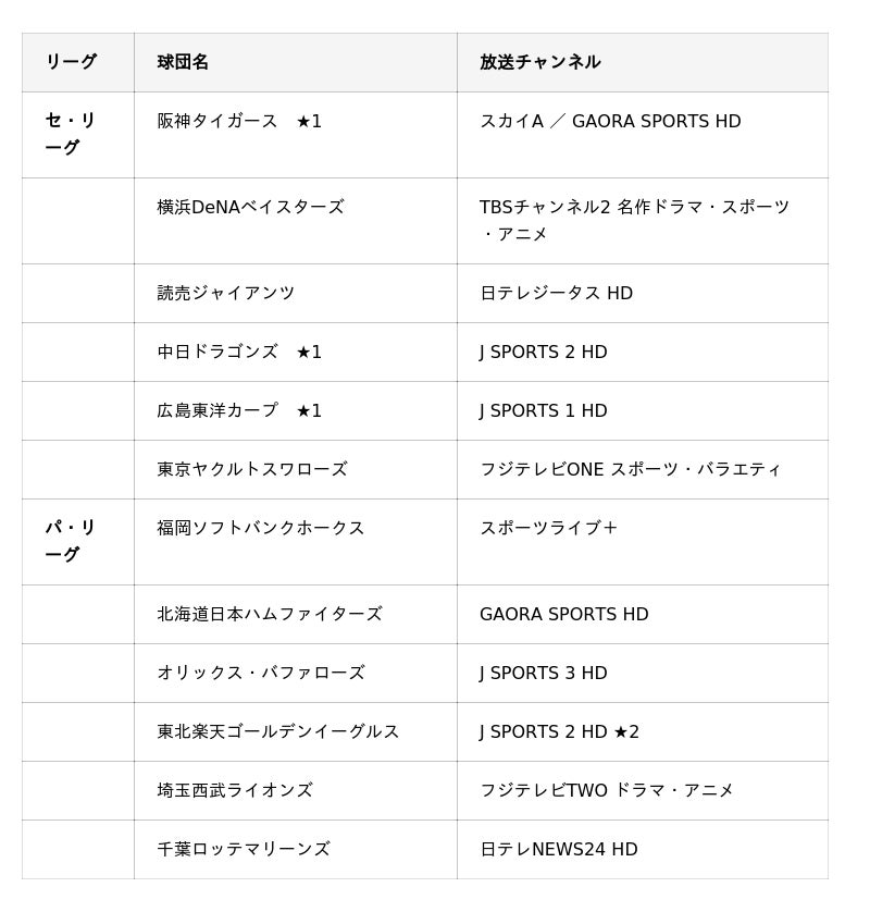 ★1 対読売ジャイアンツ戦については、放送チャンネルが異なる場合があります。