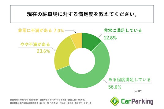 続いて、都内在住の外部の月極駐車場利用者を対象に「現在の駐車場に対する満足度」を尋ねる設問への回答では、1位が「ある程度満足している」で56.6%、2位が「やや不満がある」で23.6%、3位が「非常に満足している」で12.8%、4位が「非常に不満がある」で7.0%という結果になりました。「ある程度満足している」という回答が最も多いものの、2位と4位の回答を合計すると回答率30.6%となり、この結果から、都内在住の外部の月極駐車場利用者の3割以上が、程度の差こそあれ、現在の駐車場に不満があることが明らかになりました。