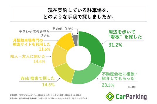 調査の最後、都内在住の外部の月極駐車場利用者を対象に「現在契約している駐車場をどのような手段で探したか」を尋ねる設問への回答では、1位が「周辺を歩いて“看板”を探した」で31.2%、2位が「不動産会社に相談・紹介してもらった」で23.3%、3位が「Web検索で探した」で14.6%という結果になりました。