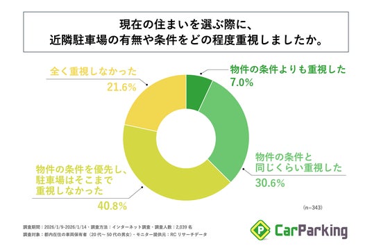 すると回答率62.4%となり、この結果から、都内在住の外部の月極駐車場利用者の6割以上が、現在の住まいを選ぶ際に、程度の差こそあれ、近隣駐車場の有無や条件を重視しなかったことがわかりました。