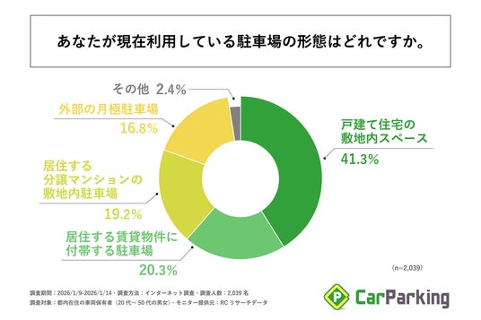 まず、「自身が現在利用している駐車場の形態はどれか」を尋ねる設問への回答では、1位が「戸建て住宅の敷地内スペース」で41.3%、2位が「居住する賃貸物件に付帯する駐車場」で20.3%、3位が「居住する分譲マンションの敷地内駐車場」で19.2%という結果になりました。