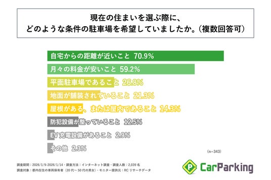 また、都内在住の外部の月極駐車場利用者を対象に「現在の住まいを選ぶ際にどのような条件の駐車場を希望していたか」を尋ねる設問への回答では、1位が「自宅からの距離が近いこと」で70.9%、2位が「月々の料金が安いこと」で59.2%、3位が「平面駐車場であること」で26.8%という結果になりました。