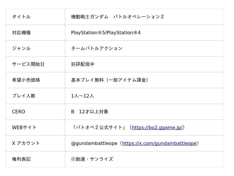 株式会社バンダイナムコエンターテインメントは、PlayStation(R)5/PlayStation(R)4向けオンライン専用ゲーム『機動戦士ガンダム バトルオペレーション2』 (以下、『バトオペ2』)にて、
