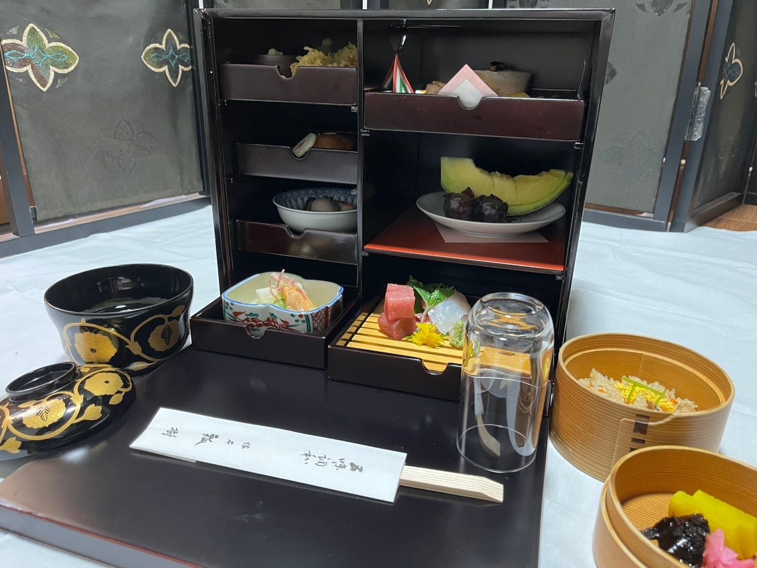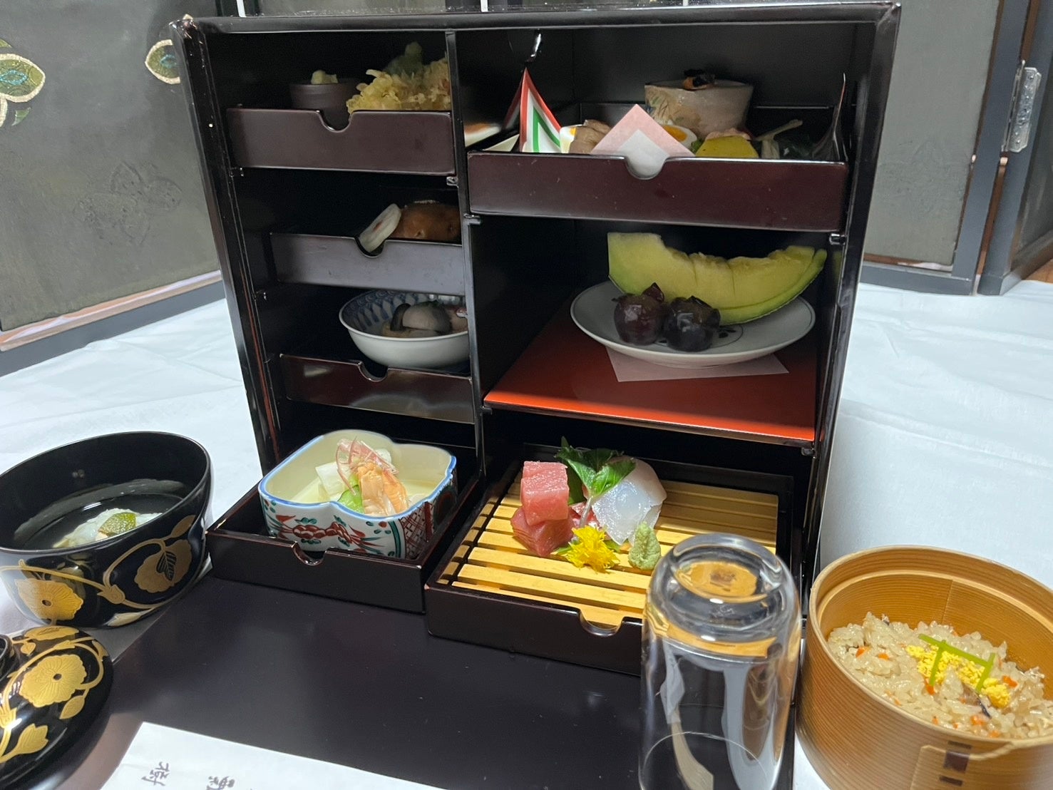 長年培ってきた技と味わいをそのままに、季節の食材を丁寧に仕立て彩り豊かに引出しに収めました。一品ずつ配置された通い味箱膳は配膳しやすく、蓋を開けた瞬間から目でも楽しめる設えとなっております。