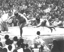 1950年頃、初代社長 名取光男は海産物の仕入れのため築地へと通い、同業者に誘われて相撲観戦をするようになりました。たまたま時津風部屋を贔屓(ひいき)にしていた方から当時の人気横綱・双葉山を紹介していただき、同じ時津風部屋の関取・若葉山(現在活躍されている若隆景と若元春の祖父)の東京後援会長を引き受けたのが相撲との縁でした。
