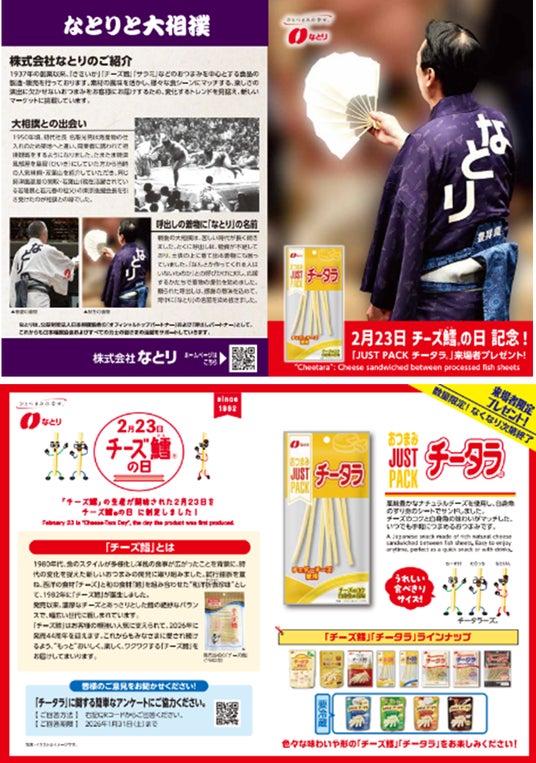 株式会社なとり(本社:東京都北区 会長兼社長:名取三郎)は、1月22日(木)に、大相撲一月場所を開催していた両国国技館にて、ご来場のお客様に「JUST PACK チータラ(R)」のサンプリングを実施いたしました。