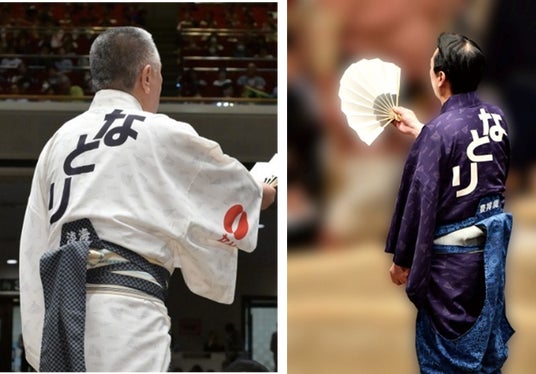 戦後の大相撲は、苦しい時代が長く続きました。とくに呼出しは物資が不足しており、土俵の上に着て出る着物にも困っていました。『なんとか作ってくれる人はいないものか』との呼びかけに対し、応援するかたちで着物の提供を始めました。贈られた呼出しは、感謝の意味を込めて、背中に「なとり」の名前を染め抜きました。