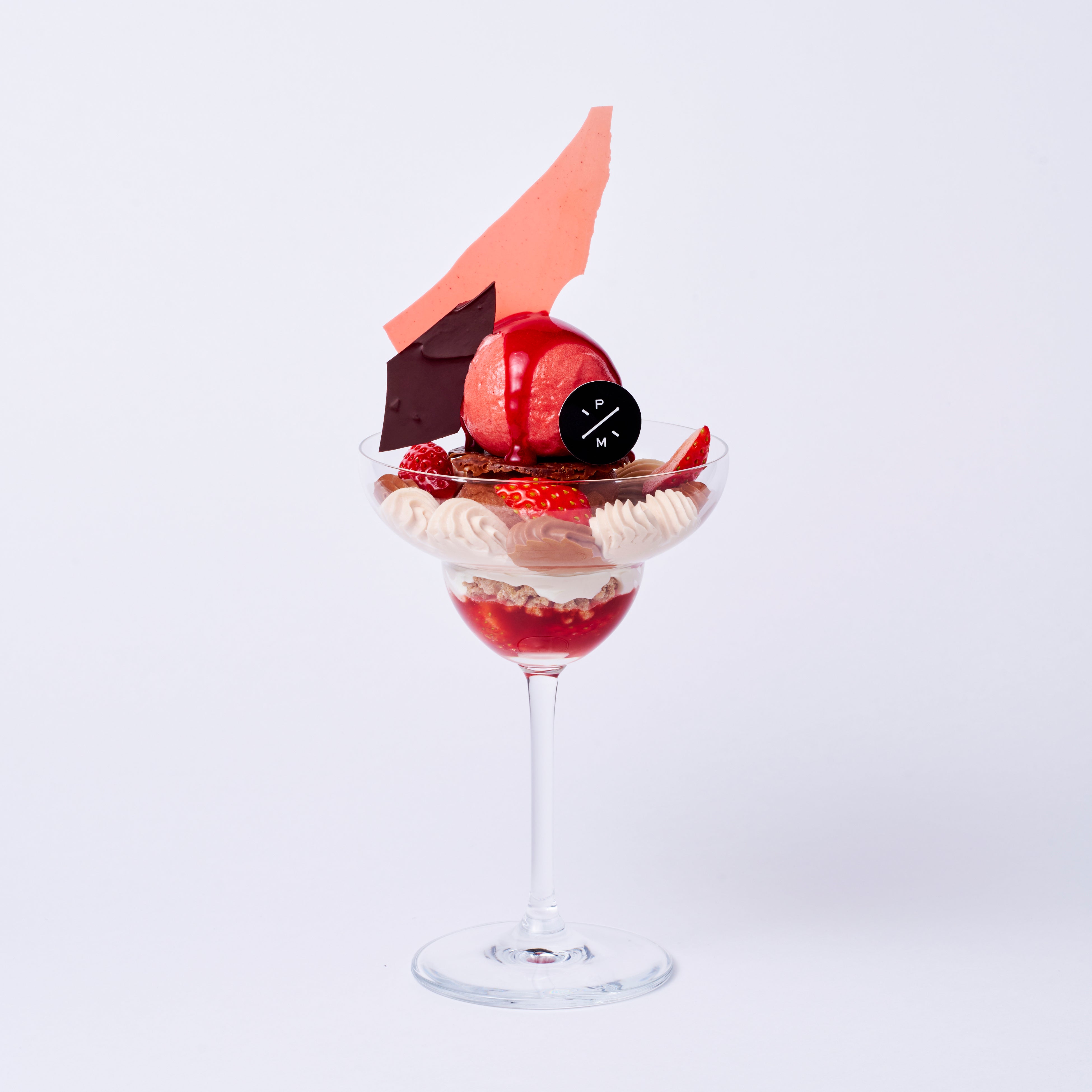 【パフェ ア ラ ミニュット フレーズ & ショコラ】シルキーなストロベリーソルベとチョコレートアイスクリームにガナッシュ モンテ フレーズとガナッシュ モンテ ノワール。フレッシュストロベリーとスペキュロス ブランの歯応えが絶妙。瑞々しい季節の風味をお楽しみください。